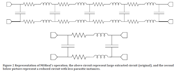 The market always pushes towards building fast chips that can perform multiple operations at once; therefore, industry leaders are required to construct complex chip designs operating at very high frequencies. However, extracting these parasitic effects of the chip results in a gigantic circuit that contains a large number of parasitic instances, and it becomes hard and sometimes impossible to simulate this huge circuit to study delay, noise, power consumption, and other important analyses. Reducing this gigantic circuit to a small one while preserving all of its properties and characteristics is the function of “Model Order Reduction (MOR).” MOReal is a MOR tool that can reduce large circuits full of parasitic instances to a smaller circuit ready for post-layout simulations and analyses. As an example, please, refer to the next figure.