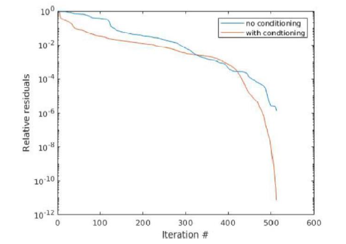 MOReal does more than reducing nodes and elements of the input circuits. Not only it performs reduction of nodes and elements in a unique novel way enabling reaching very high reduction ratios without sacrificing accuracy, it also produces a reduced circuit that exhibits a better conditioning property. The graph below shows the importance of conditioning enhancement on decreasing the time of the iterative solvers employed by circuit simulators; therefore, MOReal’s reduced circuit simulates very fast on circuit simulators.